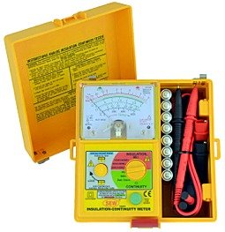 ● High quality Taut Band movement. ● Three insulation test voltages(DC) : 250V, 500V, 1000V. ● Two continuity test on low ohms : 3Ω & 500Ω. ● Compact and lightweight. ● 200mA continuity short circuit current. ● 1mA test current on insulation test at nominal voltage. ● Automatic discharge of capacitive and inductive circuit with charge stored in the circuit under test. ● Live warning and display or external voltage presence. ● Fuse, air gap, crowbar and overload protected. ● On line battery monitoring shows if battery is ok. ● Manual zero ohm adjustment. ● Low battery consumption. ● Mirror scale. ● Push and turn locking switch for continuous and hand free testing. ● BS 16 edition.