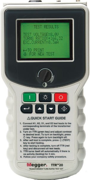 The Megger TTR20 is an automatic hand-held battery operated transformer turns ratio test set. It is used to measure the turns ratio, excitation current and polarity of windings in single- and three-phase distribution and power transformers (tested phase by phase), potential & current transformers, and tapped transformers.