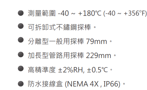 RH/Temp transmitter( -40degc~+180degc) for control/monitoring purpose. A very robust sensor(w/ transmitter) for high temperature environment. Made in USA.